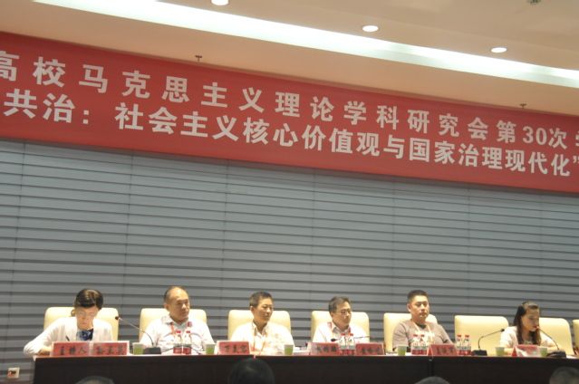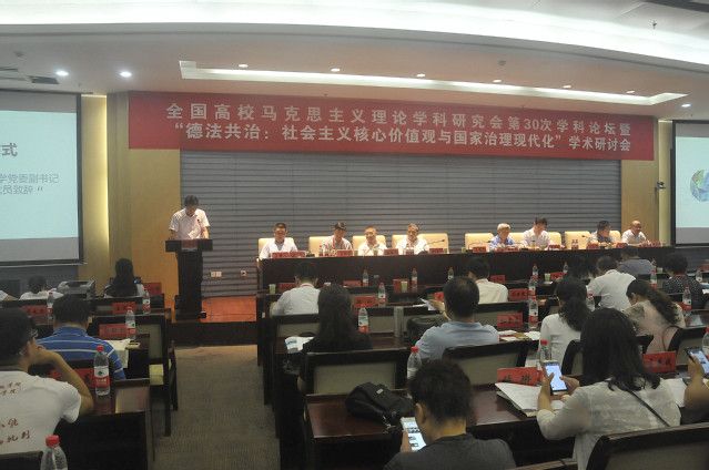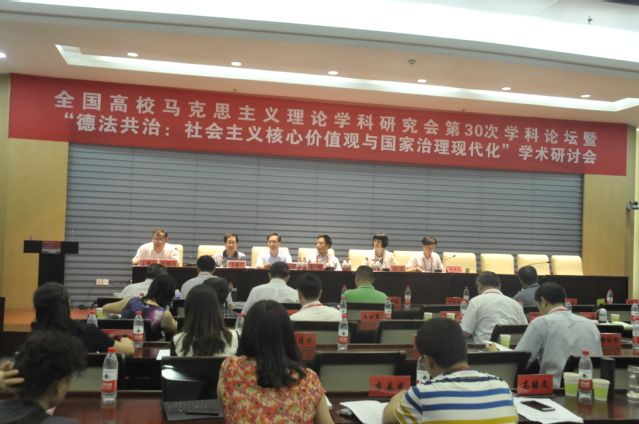 大会由三个主题报告和四组会议发言组成,与会者围绕着德治与法治的理论涵义及其内在关联、德法共治与社会主义核心价值观、国家治理现代化、执政党建设和高校思想政治教育建设等主题进行了深入的理论探讨。