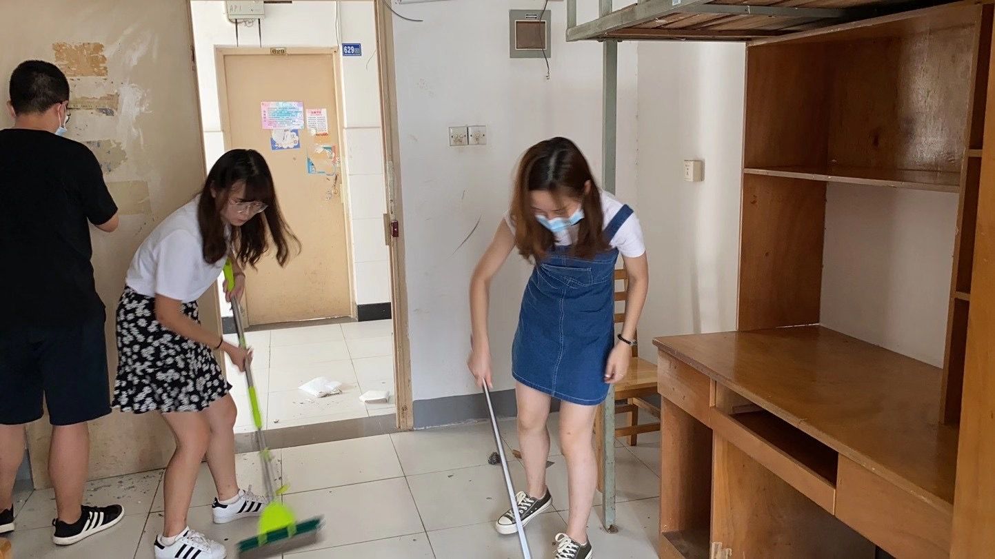 (图为7003全讯白菜网2019级同学为新生打扫宿舍卫生)